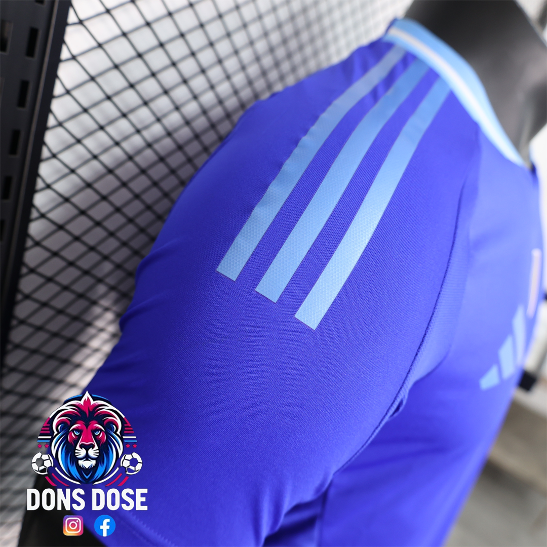 - Frente : Presenta un color azul intenso con patrones sutiles, adornado con el escudo de la selección nacional de Argentina en el pecho izquierdo.